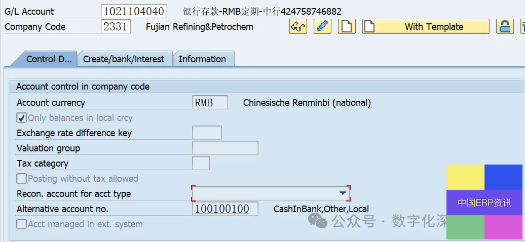 在”类型/描述”屏幕可维护集团科目,SAP中,集团科目被映射到财务合并模块的合并项目,用于集团业务合并。