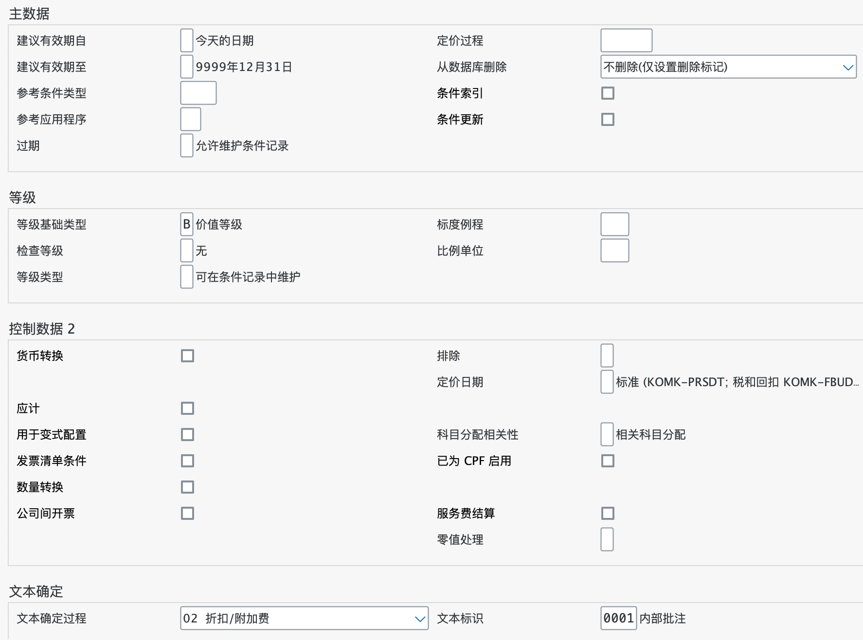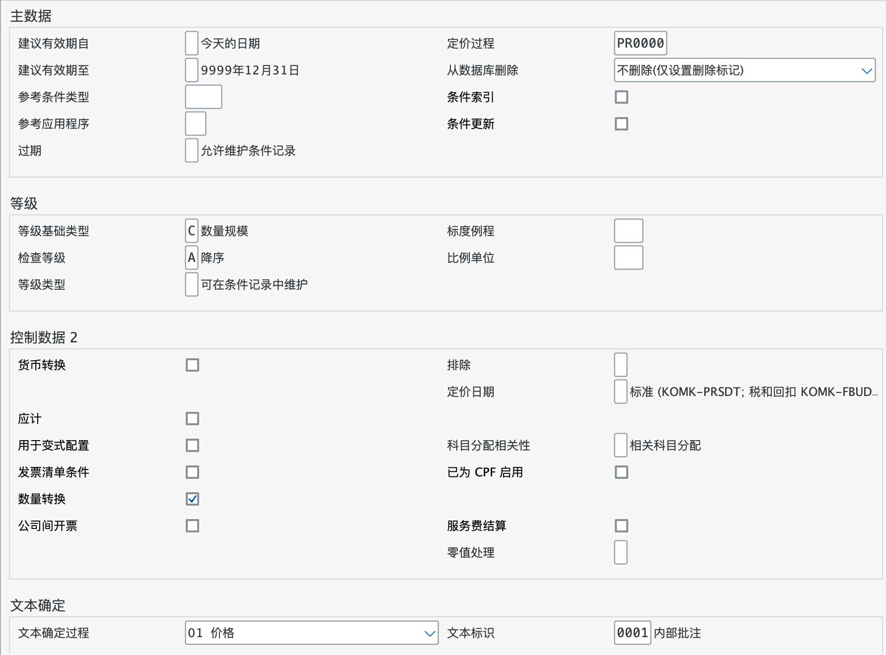 定义条件类型检索条件表的优先级。例如,存取顺序PR02按客户/物料→客户组/物料→物料顺序查找价格主数据,未命中则报错。