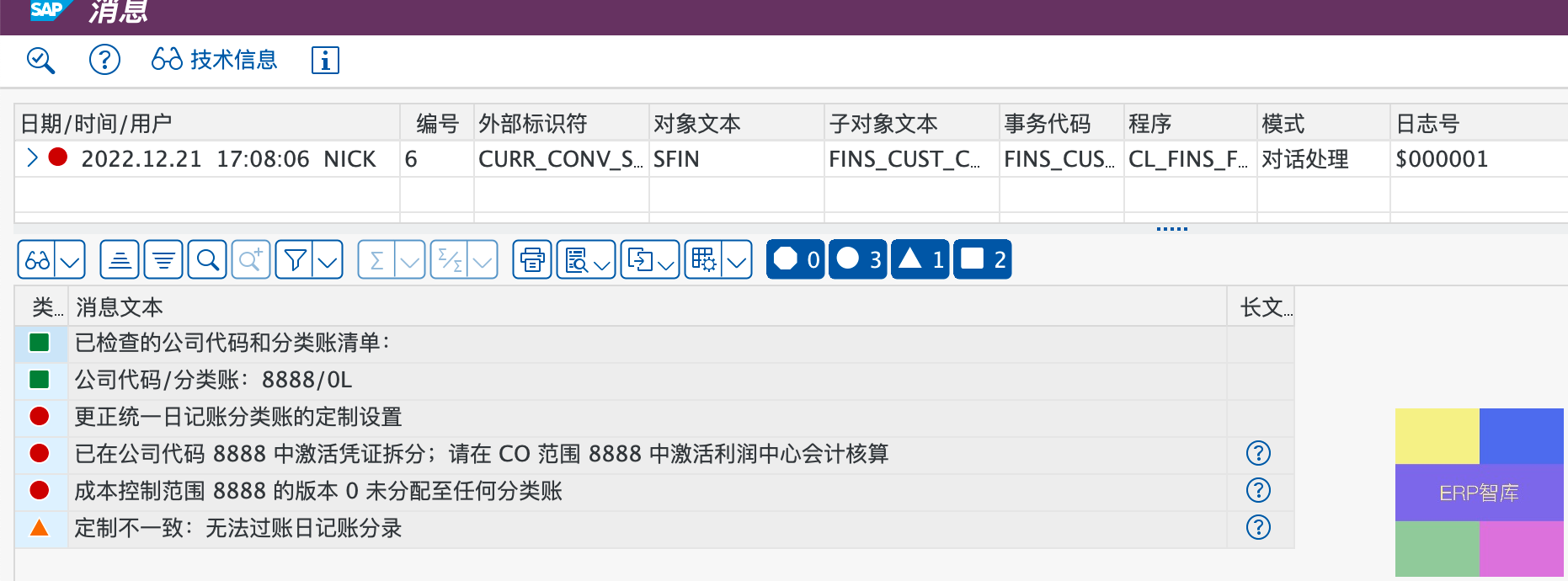决过程:1、检查统一日记账FINS_CUST_CONS_CHK_P - 运行过账定制检查2、FINSC_LEDGER - 维护统一日记账分录分类账3、再次FINS_CUST_CONS_CHK_P - 运行过账定制检查先处理这一步,事务码OKEQ4、再次FINS_CUST_CONS_CHK_P - 运行过账定制检查这一次激活利润中心会计,事务码0KE55、创建默认利润中心,事务码KE596、运行PCA实际参数控制,事务码1KEF7、激活利润中心,事务码:sm30——FINSV_TKA00_PC